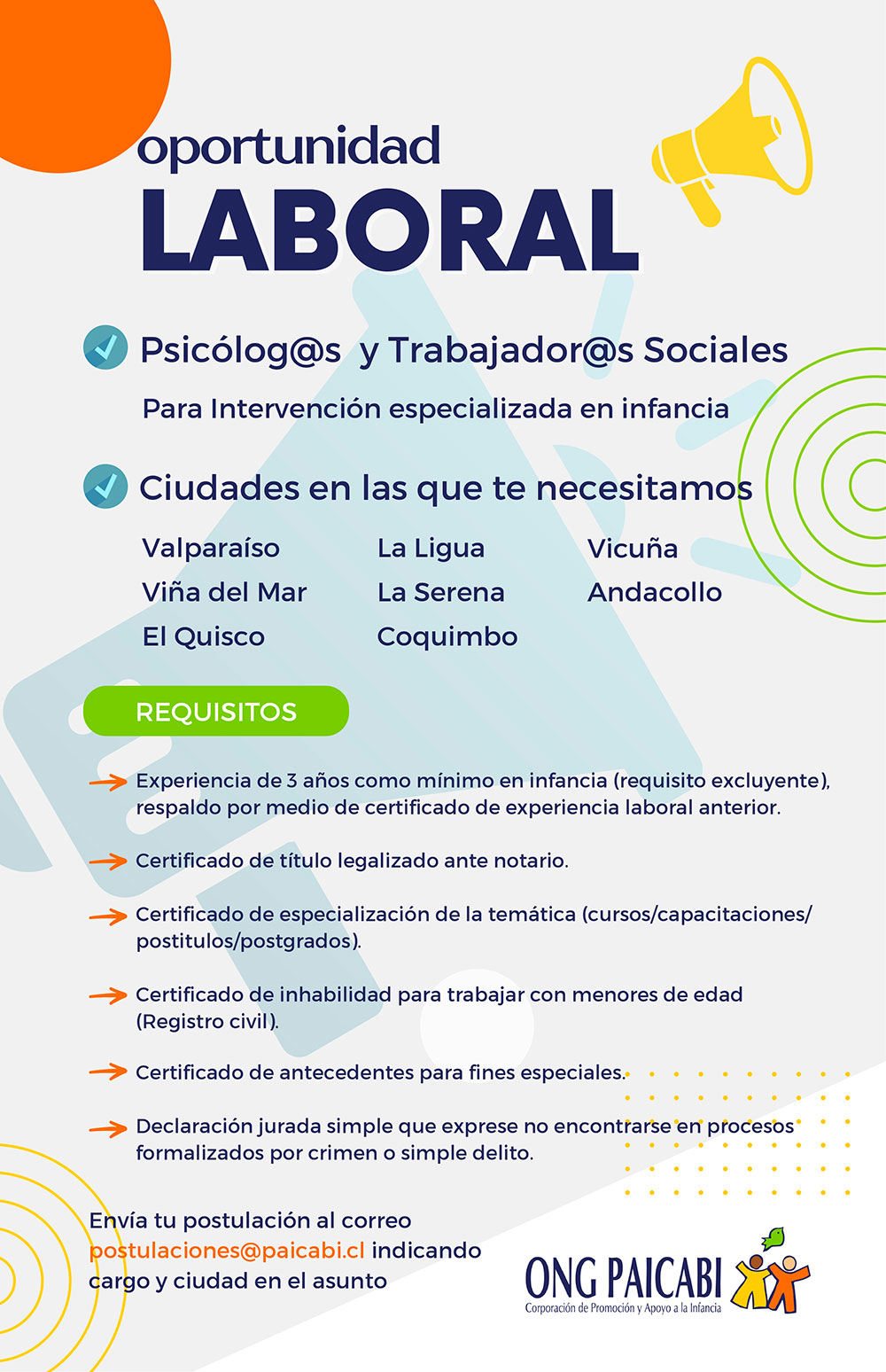 Envíanos tu documentación para postular a POSTULACIONES@PAICABI.CL indicando en asunto el cargo al que postulas y la ciudad.